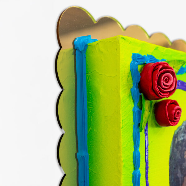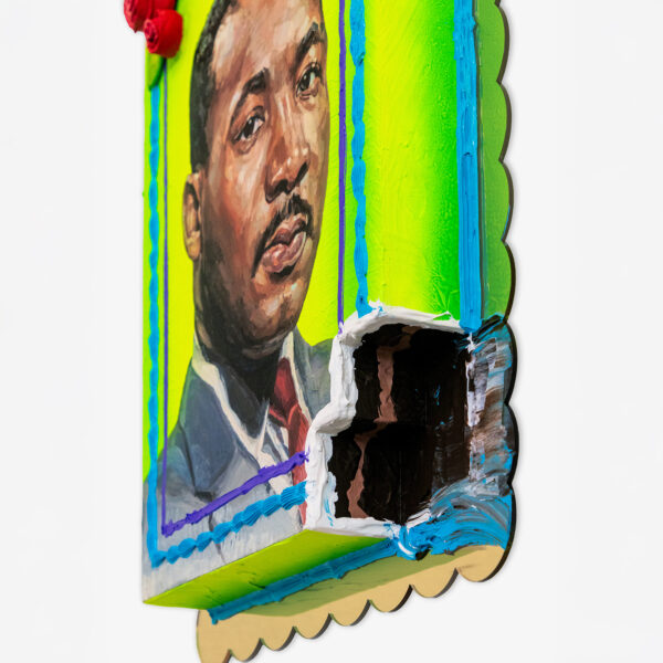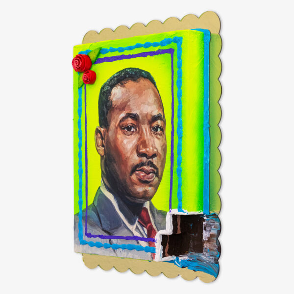 The edition Happy Birthday MLK features an ink transfer from Martinez’s 2023 portrait of the late civil rights leader Martin Luther King Jr. Each panel has a unique airbrushed background with hand-sculpted ceramic roses and decorative extruded line work made using acrylic paint. The work is mounted onto a shaped acrylic mirror and is packaged in a custom printed archival box in the style of a commercial bakery.