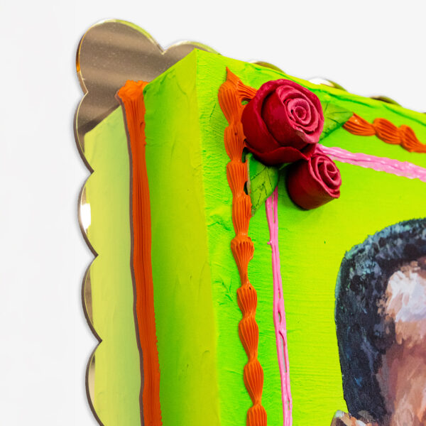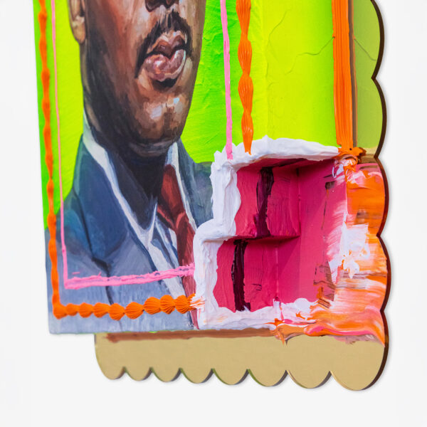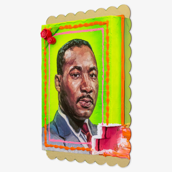 The edition Happy Birthday MLK features an ink transfer from Martinez’s 2023 portrait of the late civil rights leader Martin Luther King Jr. Each panel has a unique airbrushed background with hand-sculpted ceramic roses and decorative extruded line work made using acrylic paint. The work is mounted onto a shaped acrylic mirror and is packaged in a custom printed archival box in the style of a commercial bakery.