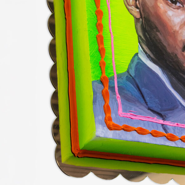 Los Angeles artist Patrick Martinez highlights civil rights leaders often overlooked in history through his distinctive “cake portraits.” These works, painted to resemble three-dimensional cakes, celebrate figures such as Angela Davis, James Baldwin, Malcolm X, and lesser-known freedom fighters like Larry Itliong. Martinez uses the cake—a universal symbol of celebration—to honor a diverse group of activists, contrasting it with traditional portraiture typically reserved for wealthy, white figures.