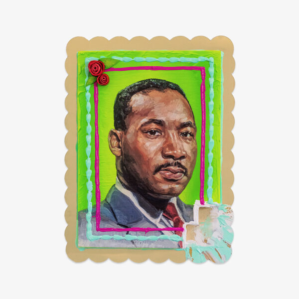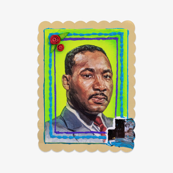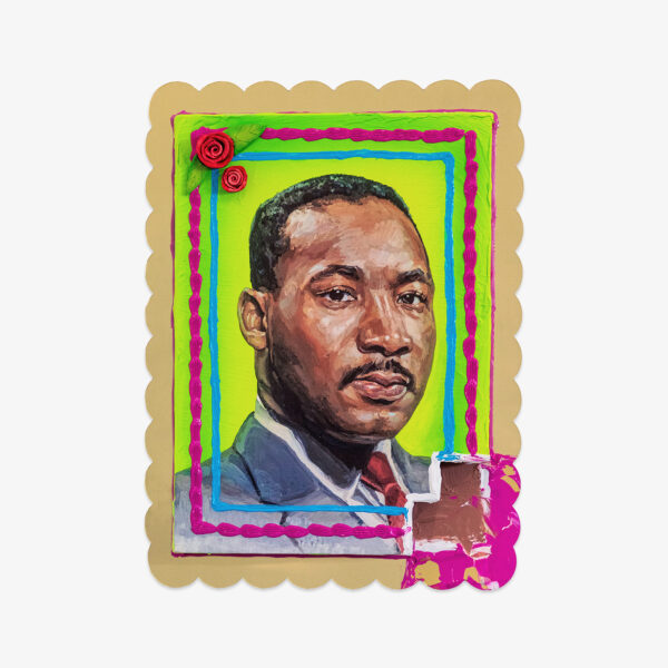 These pieces feature an ink transfer from Martinez’s 2023 portrait of the late civil rights leader Martin Luther King Jr, and each panel has a unique airbrushed background with hand-sculpted ceramic roses and decorative acrylic paint line work.
