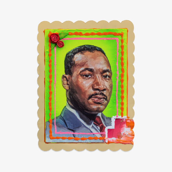 His cake paintings challenge traditional ideas of monuments: portraying civil rights activists, he prompts viewers to reconsider how we honor historical figures, blending the mundane with the monumental to reflect both past and present struggles for justice.